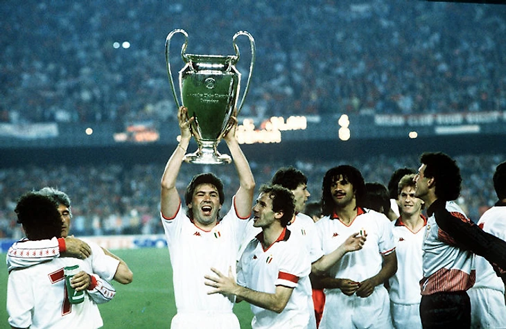 На излете мая 1989 года «Милан» разгромил (4:0 – дубли Гуллита и ван Бастена) на «Камп Ноу» в финале Кубка чемпионов «Стяуа» Дана Петреску и Георге Хаджи, а Карло Анчелотти отработал игру в полузащите вместе с Анджело Коломбо (справа), Роберто Донадони (слева) и Франком Райкардом (в центре). Интересно, что во второй серии полуфинала, на «Сан-Сиро», «Милан» разнес «Реал» (5:0), а первый мяч в ворота своего будущего клуба забил как раз Анчелотти.