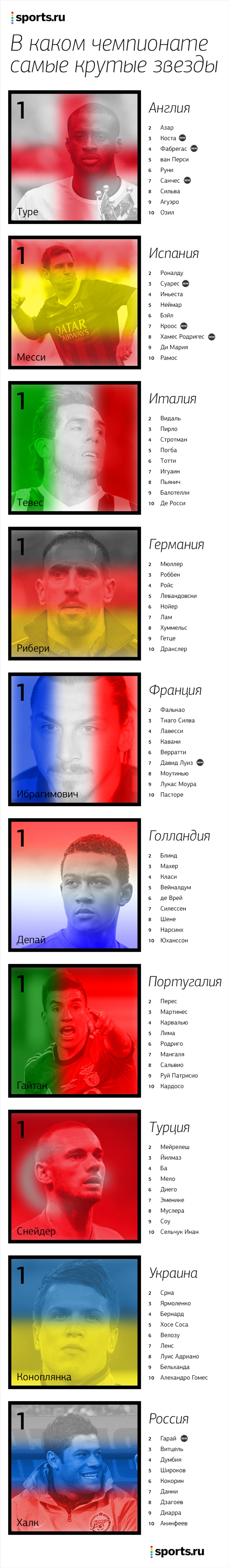 Суарес, Месси и Роналду против Яя Туре, Руни и Азара – Sports.ru называет 10 главных звезд каждого из главных европейских чемпионатов и предлагает вам их сравнить.