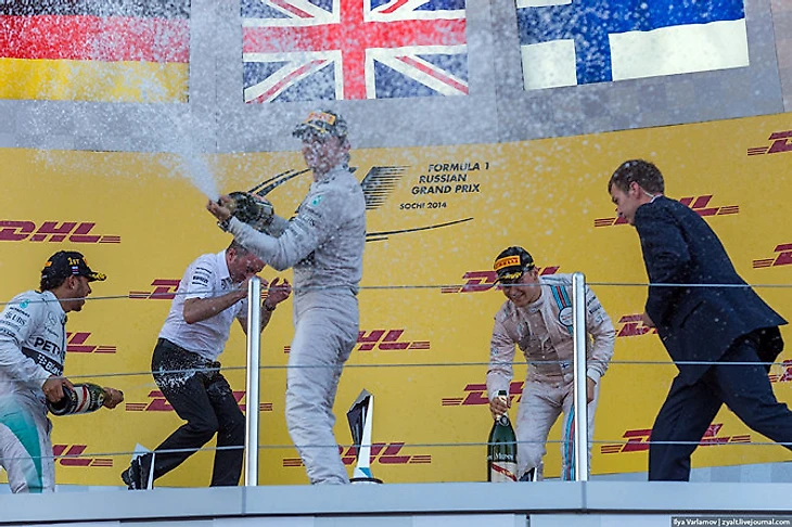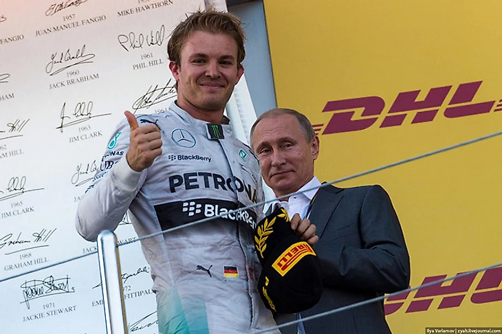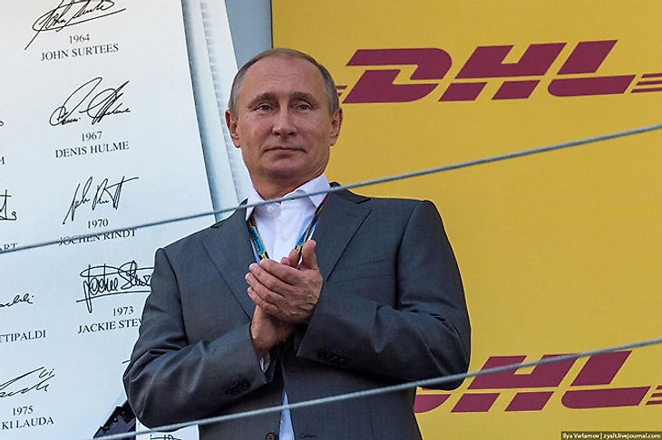 07. Путин вышел к пьедесталу, чтобы наградить гонщиков. Народ начал скандировать: «СПА-СИ-БО!» Имелось ввиду спасибо за Формулу 1 в Сочи.