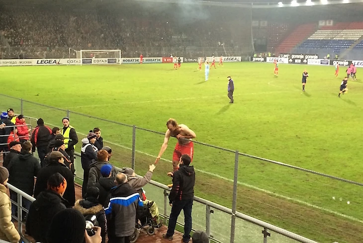Впрочем, не все фанаты в Раменском получали удовольствие только от встречи с врагом. После финального свистка Виталий Денисов запрыгнул на небольшое ограждение и перекинул руку через сетчатый металлический забор – чтобы передать футболку болельщику на инвалидной коляске.