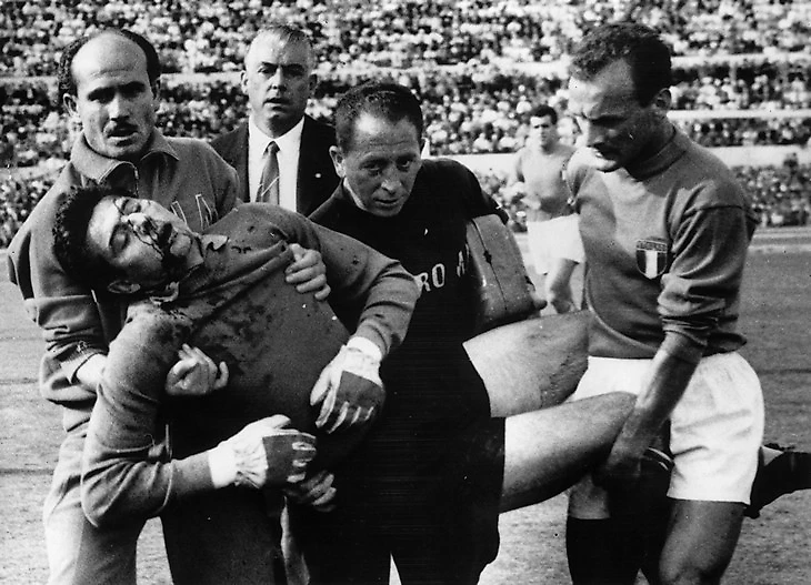 2 из 17 матчей за Италию Лоренцо Буффон не доиграл из-за травм. На этом фото его уносят с поля со сломанным носом на 55-й минуте товарищеского матча с англичанами в мае 1961-го. Без основного вратаря, пропустившего только один гол, итальянцы проиграли 2:3.