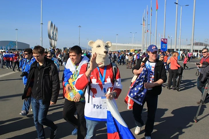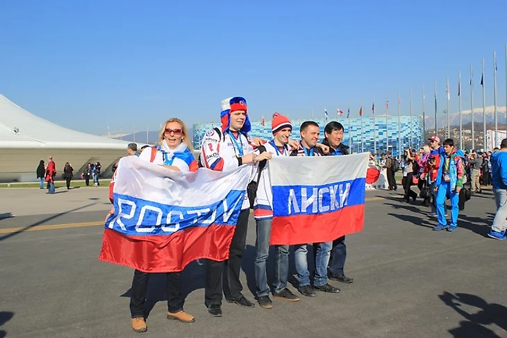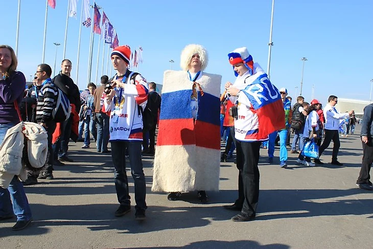 По дороге, ведущей к ледовому дворцу «Большой» можно освежить знания географии – на флагах российских болельщиков встречаются более-менее все крупные города и регионы. На площади перед дворцом смешиваются культуры, стили, да вообще все: детишки в майках «Вашингтона», казаки, хиппи, бурки, медведи, буденовки, Louis Vuitton, флаги США, знамена времен СССР.