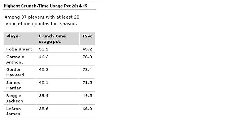 Все знают, что Кобе не доверяет партнерам. Все знают, кому он доверяет. Все умеют делать выводы и без цифр. Но цифры просто выносят мозг: Брайант занимает первое место в лиге по проценту использования (36,8), но на последних минутах эта цифры вырастает до 52, превращаясь в нечто нереальное.