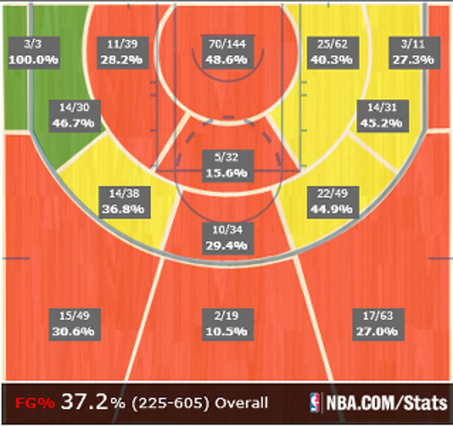 Но Брайант продолжает совершать все те же сумасшедшие неэффективные броски. Они когда-то залетали, но теперь нет: его процент в таких ситуациях (32,7) – хуже среднего процента сложных бросков по лиге (33,4) и совершенно несопоставим с Кармело и прочими.