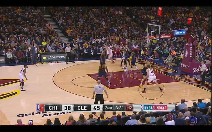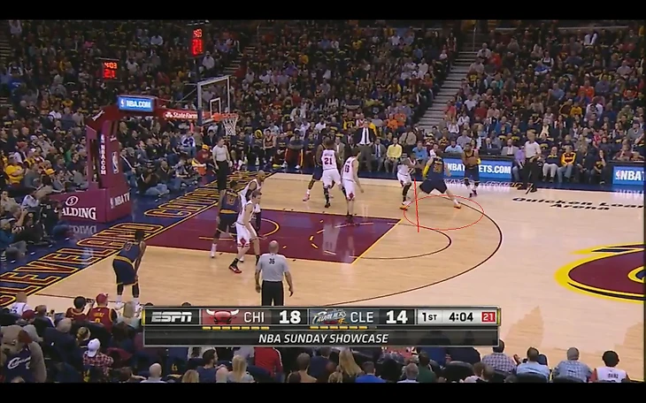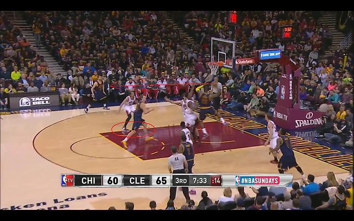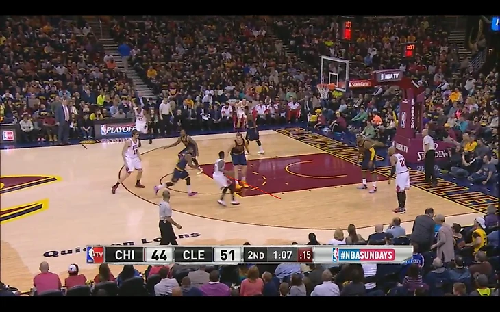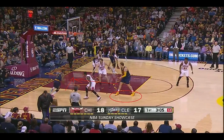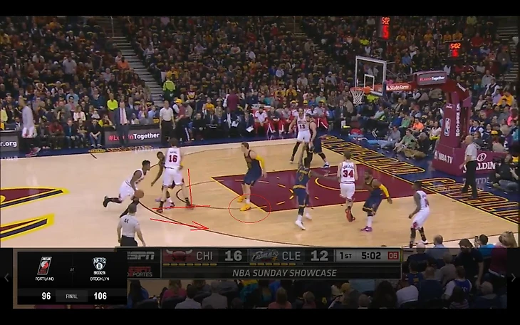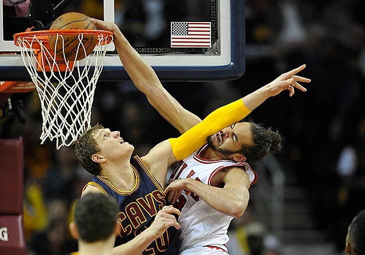 В матче с «Чикаго» и Аарон Брукс, и Джимми Батлер опасались идти под кольцо против Мозгова, предпочитая искать другое направление или бросать с дистанции. При этом, даже когда у «Чикаго» вроде бы получался пик-н-поп (как вот здесь, где Брукс отбрасывает мяч Газолю), скорость Тимы позволяла ему быстро восстановить позицию и успеть помешать броску.