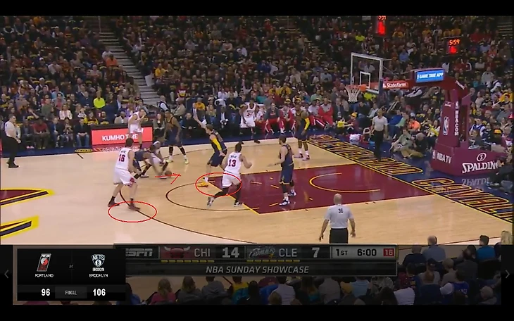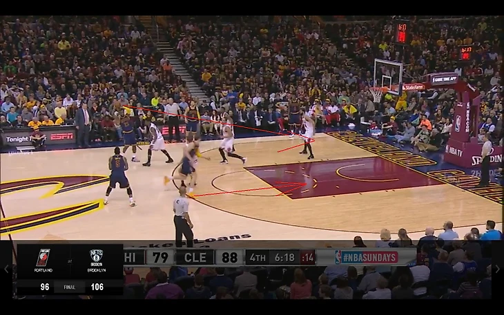 При пик-н-ролле Мозгов бежит к кольцу параллельно с Джеймсом. На него смещается Ноа, оставляя Лава в углу – скидка следует именно туда.