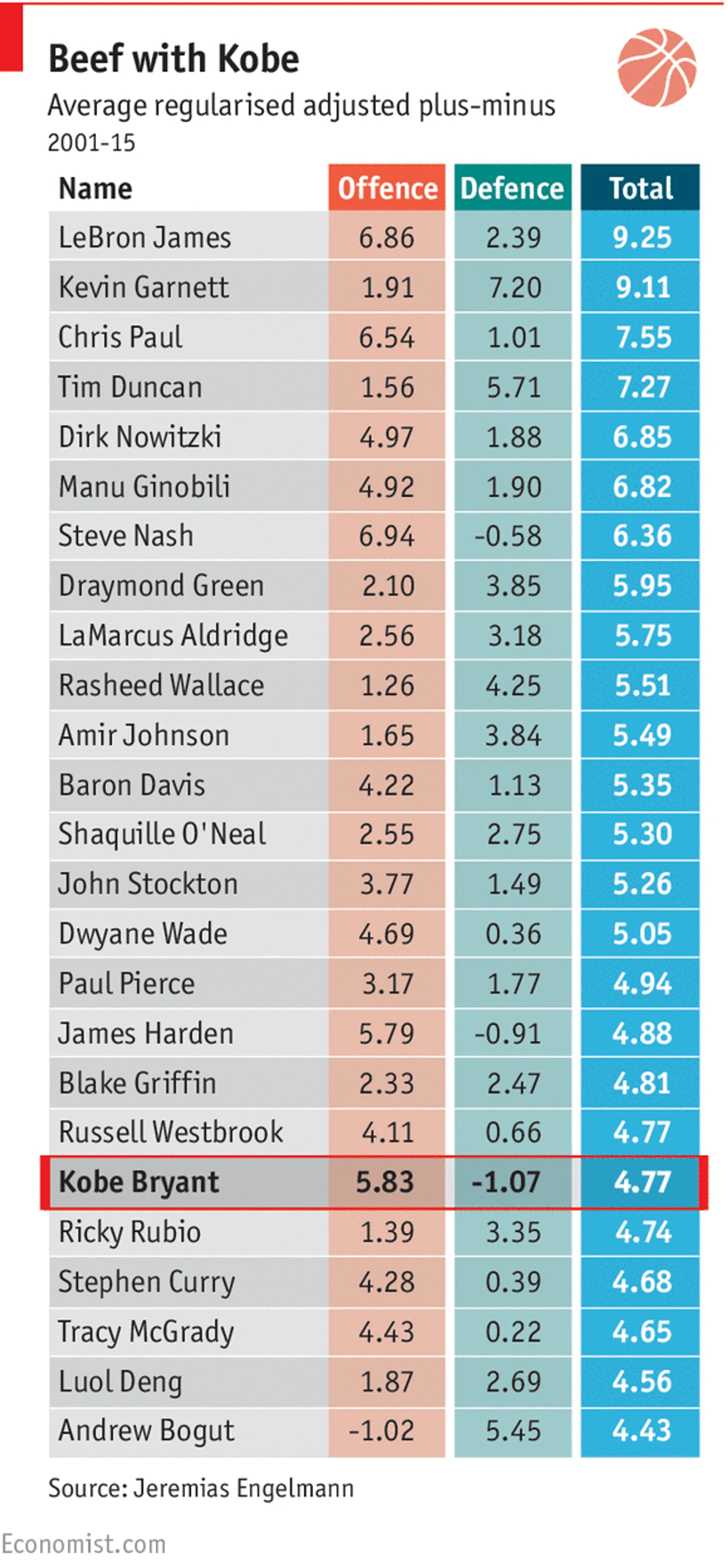 Если суммировать цифры по защите и нападению, то в общем рейтинге за последние 15 лет Брайант оказывается на 19-м месте, его вклад составляет 4,77 очка на 100 владений. (Предсказуемо первое место занимает Леброн Джеймс (9,25 очка). Никто, кроме Кобе Брайанта, не будет спорить с тем, что он располагается ниже признанных великих игроков, как, например, Шакил О’Нил. Но даже те, кто сомневаются в его талантах, будут удивлены тем, что выше его находится не особенно примечательный получающий среднюю зарплату игрок оборонительного плана вроде Амира Джонсона, который с показателями в 5,49 очка расположился на 11-м месте.