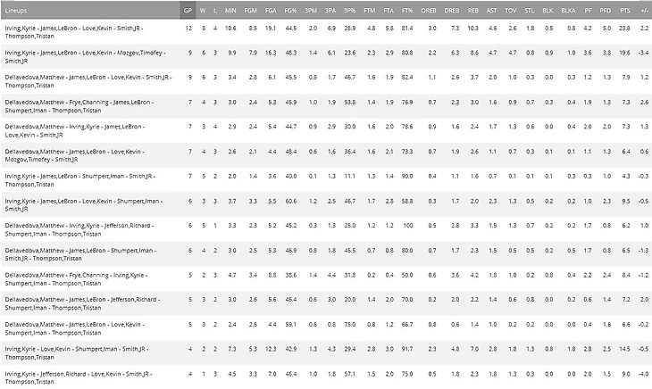 Нововведения кончились. Вернулись к тому же, что и было. Только при этом проиграли с полным ростером больше матчей более слабым командам, чем при Блатте. Кирилл правильно заметил, что Кайри в обороне стал никакой, высокий темп пагубно сказался на обороне, а связка Делли-Кайри эффективно работала и в прошлом году. В последнее время ее используют немного больше, но лайнап был отработан еще прошлым тренером. Из нового можно отметить Шамперта в старте на третьем номере - Леброн на четвертом и эксперименты с Лавом на пятерке. Но большей эффективности это не принесло, т.к. Шамп малополезен в атаке. Лав далеко не всегда хорош в центре, одну игру из-за этого они проиграли, вторую с трудом вытянули.