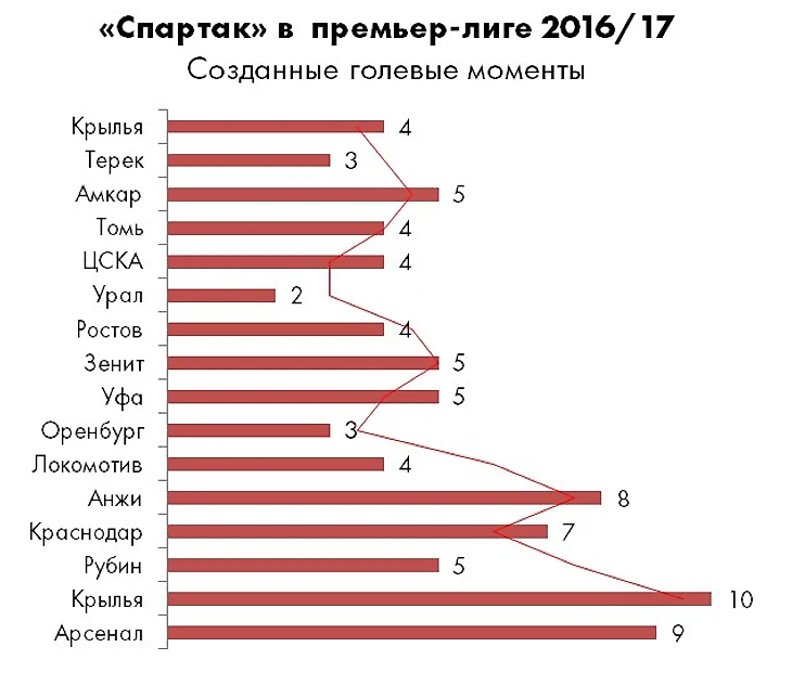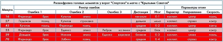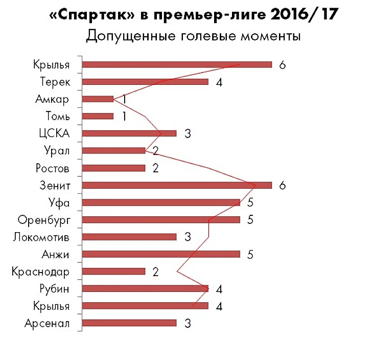 В 6 предыдущих турах количественный уровень опасности у ворот Реброва определялся средним значением в 2,17 допущенных голевых моментов, тогда как после первых 9 матчей он был практически вдвое выше (4,11). Тем не менее, провал в Самаре вскрыл сразу несколько проблем обороны «Спартака», которые до сих пор были не так очевидны для обывателя.