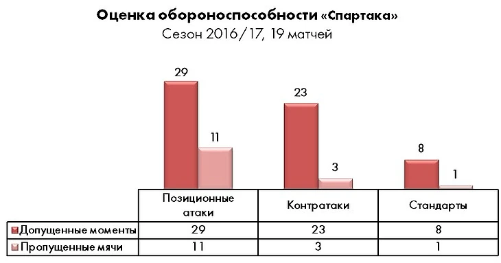 В первую очередь это касается противодействия контратакам, которые у хозяев проходили без проблем и дважды оказались голевыми. Примечательно, что с начала сезона красно-белые пропустили лишь один мяч после контратаки в матче с «Уфой», когда к голу Фатая привела техническая ошибка Кутепова. При этом в остальных 18 эпизодах (!) спартаковцам удавалось отбиться, тогда как, например, в первой половине сезона прошлого красно-белые из 28 контратак на свои ворота пропустили в 5 случаях.