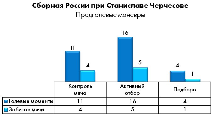 При Черчесове сборная России создаёт минимум голевых угроз после атак с длительным пассивным контролем, а вот элементы прессинга (отборы/перехваты/подборы) преобразует в опасные ситуации (чаще всего, контратаки) достаточно регулярно.