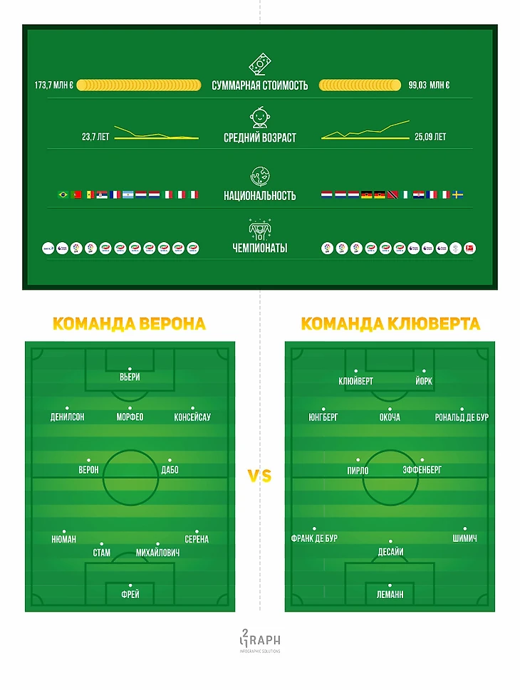 Получилось 2 команды, которые мы символично назвали «Команда Верона» и «Команда Клюйверта». Голосуйте за наиболее понравившуюся, а свои мнения о составах оставляйте в комментариях.