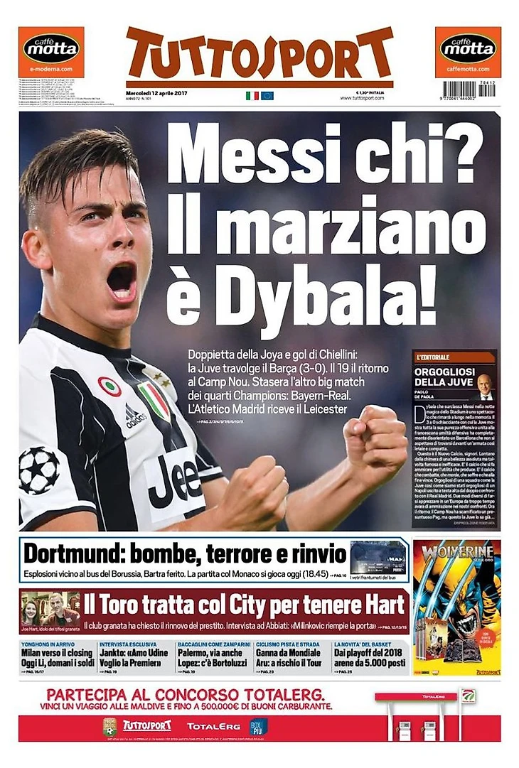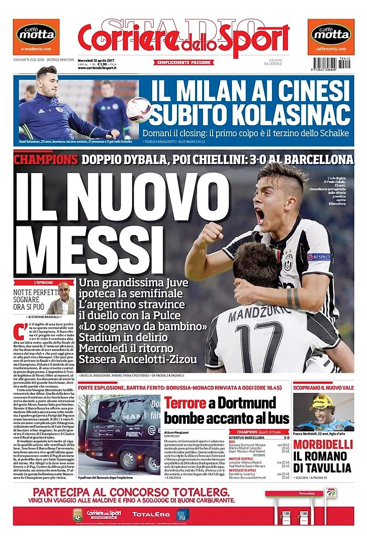 «Юве» сказочен, урок для «Барсы». Супер Дибала освящён перед Месси. Сразу два волшебства в течение четверти часа. Кьеллини завершил триумф: каталонцы потерпели крах как в Париже. Аргентинец: «Это невероятный вечер, мечтал об этом всю жизнь». Луис Энрике: «Можем забить четыре гола кому угодно».