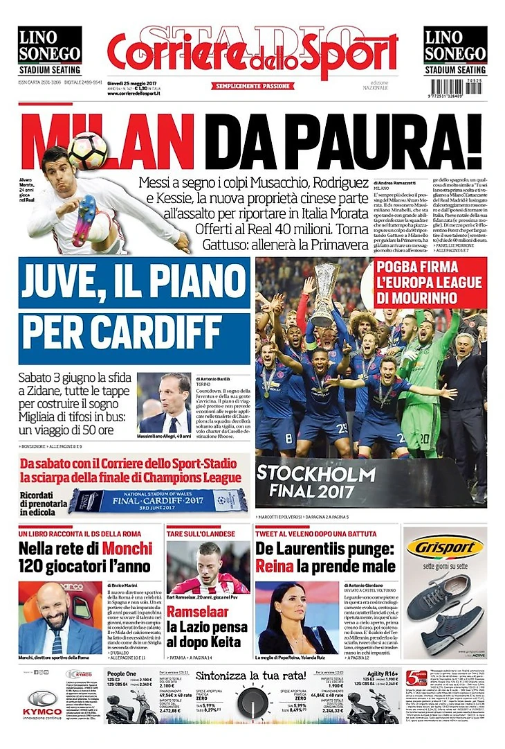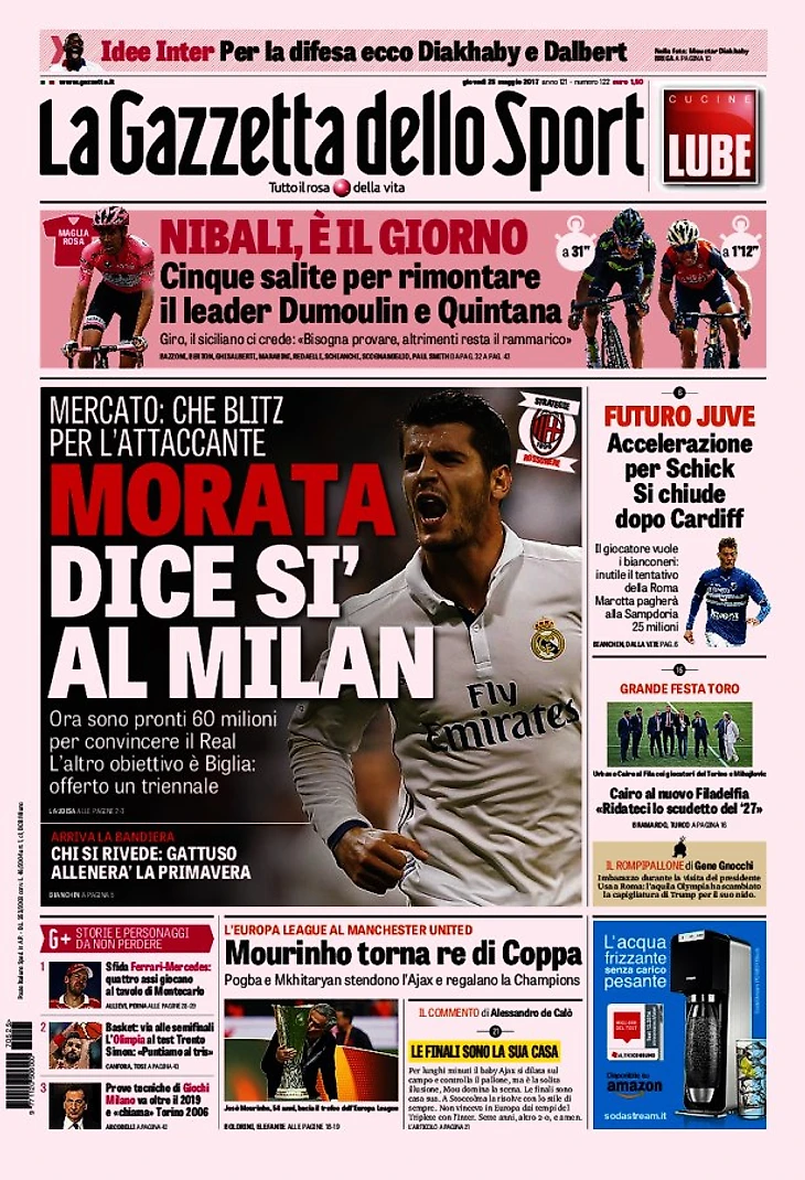«Мората говорит «да» «Милану». Заголовки Gazzetta, TuttoSport и Corriere за 25 мая