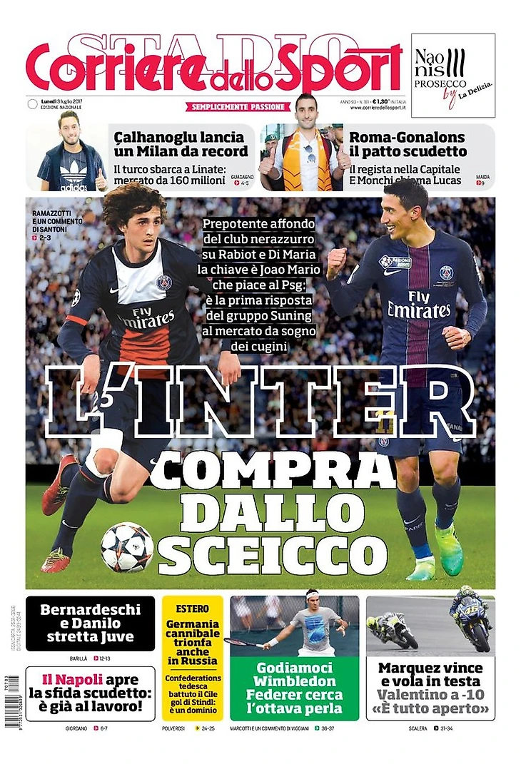 Сверхмощный выпад черно-синего клуба по Рабьо и Ди Марии, ключ – это Жоау Мариу, который нравится «ПСЖ»: это первый ответ группы Suning на рынок мечты от кузенов.