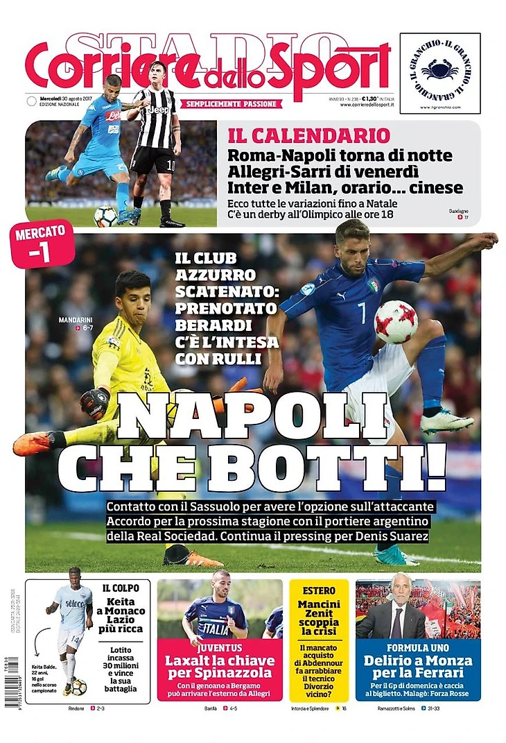 Клуб Адзурри разошёлся: зарезервирован Берарди, есть соглашение с Рульи. Контакты с «Сассуоло», чтобы получить опцию по нападающему. Соглашение на следующий сезон с аргентинским вратарём «Реал Сосьедада». Продолжается давление на Дениса Суареса.