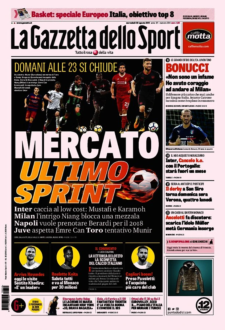 Рынок, последняя гонка. Заголовки Gazzetta, TuttoSport и Corriere за 30 августа