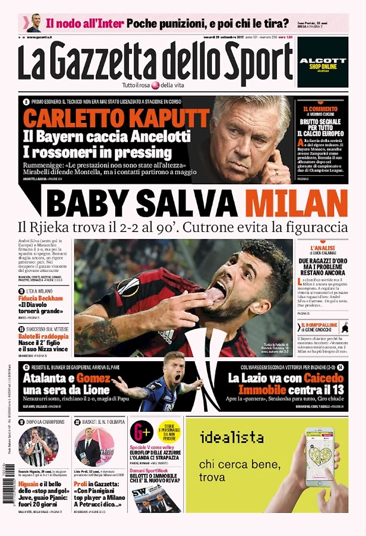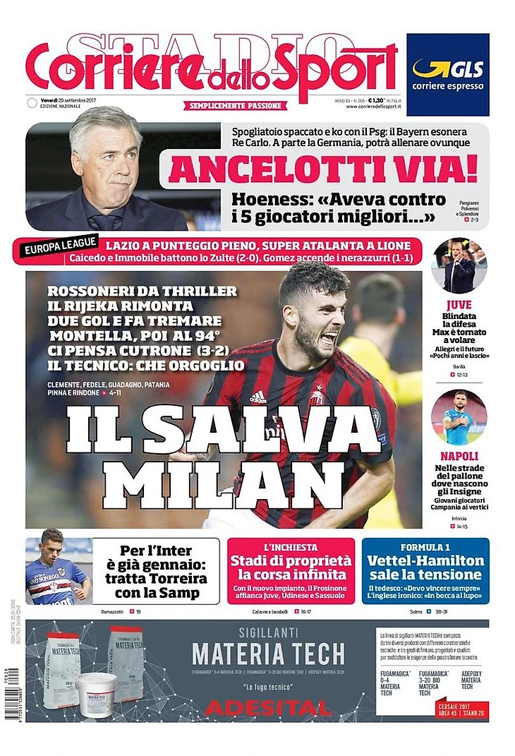 Спасение «Милана». Заголовки Gazzetta, TuttoSport и Corriere за 29 сентября