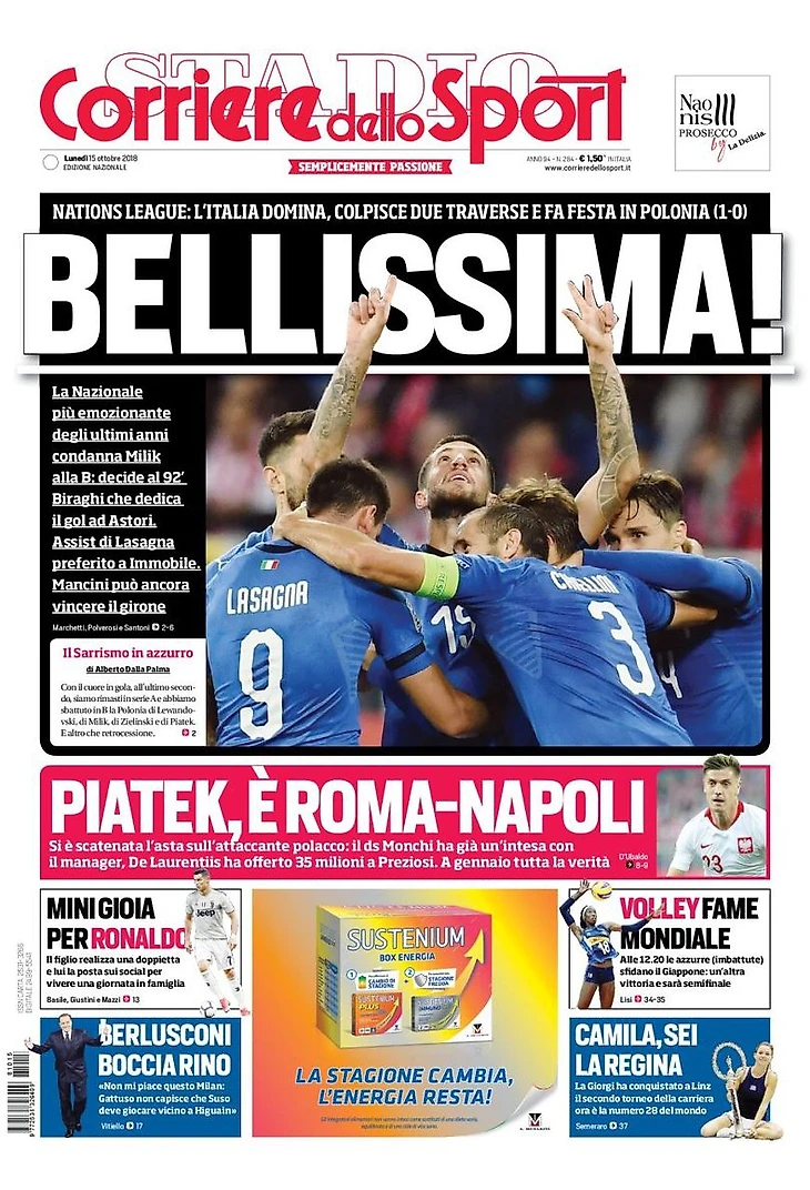Лига Наций: Италия доминировала, дважды попала в перекладину и отпраздновала успех в Польше (1:0). Самая эмоциональная сборная последних лет отправила Милика в дивизион Б: всё решил на 92 минуте Бираги, который посвятил гол Астори. Передача Лазаньи, который был предпочтён Иммобиле. Манчини ещё может выиграть группу.