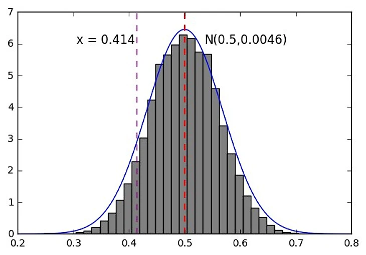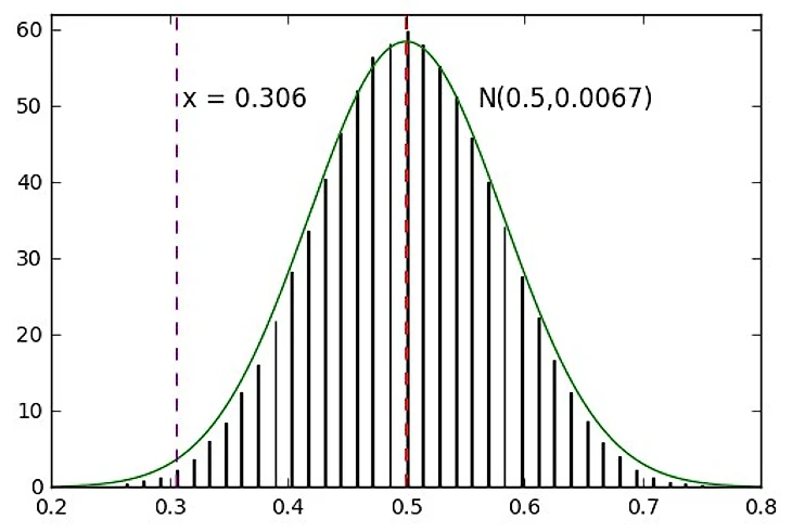 Рассмотрим, насколько маловероятно получившееся выборочное среднее для всех рассматриваемых жеребьевок. Согласно центральной предельной теореме, распределение выборочных средних, при условии достаточно большого n, будет стремиться к нормальному. Обратим внимание, что проверяемое нами распределение является дискретным, что, тем не менее, не будет являться проблемой при его приближении непрерывным. Оценим сверху дисперсию нормального распределения, приближающего распределение выборочных средних по выборке объема n = 15. Матожидание, очевидно, будет равняться 0,5.