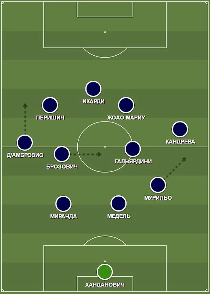 В свою очередь, Стефано Пиоли предпринял достаточно нестандартный ход. Вместо привычной схемы 4-2-3-1, миланский специалист предпочел 3-4-2-1. После проигранного кубкового матча против «Лацио» тренер сделал четыре замены. Трио центрбеков довершил Гари Медель, который заменил Кристиана Ансальди. На скамейке остался Жоффрей Кондогбия, вместо которого на поле появился Роберто Гальярдини. Вся правая бровка в отсутствие Ансальди была отдана на откуп Кандреве, однако туда по ходу матча часто смещался Мурильо, а на противоположном фланге играл Данило Д'Амброзио. В зоне атакующих хавов пару Перишичу составил Жоао Мариу, сменивший Банегу. Последняя замена – выход с первых минут Мауро Икарди вместо Родриго Паласио.