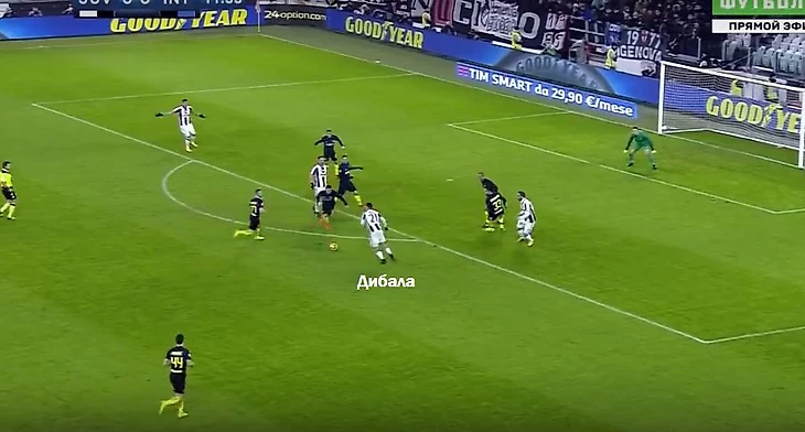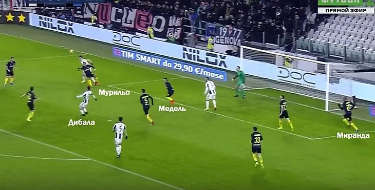 Моменты у ворот «Интера» были несколько острее. Хотя, не станем лукавить: хозяева также довольно долго не могли толком войти в штрафную. Оборонительное трио гостей хорошо перекрывало все зоны, но одна существенная проблема в их действиях была. Защитная линия часто садилась слишком глубоко, что привело, как минимум, к двум моментам у ворот Хандановича. Подопечные Аллегри использовали пространство в штрафной, в районе между граничной линией штрафной и 11-метровой отметкой, откуда периодически угрожали сопернику. Вернемся к моменту с «ножницами» Дибалы, которого никто не опекал, ведь защитная линия разместилась глубоко, а опорники не разобрались, кто должен был прикрывать Пауло.