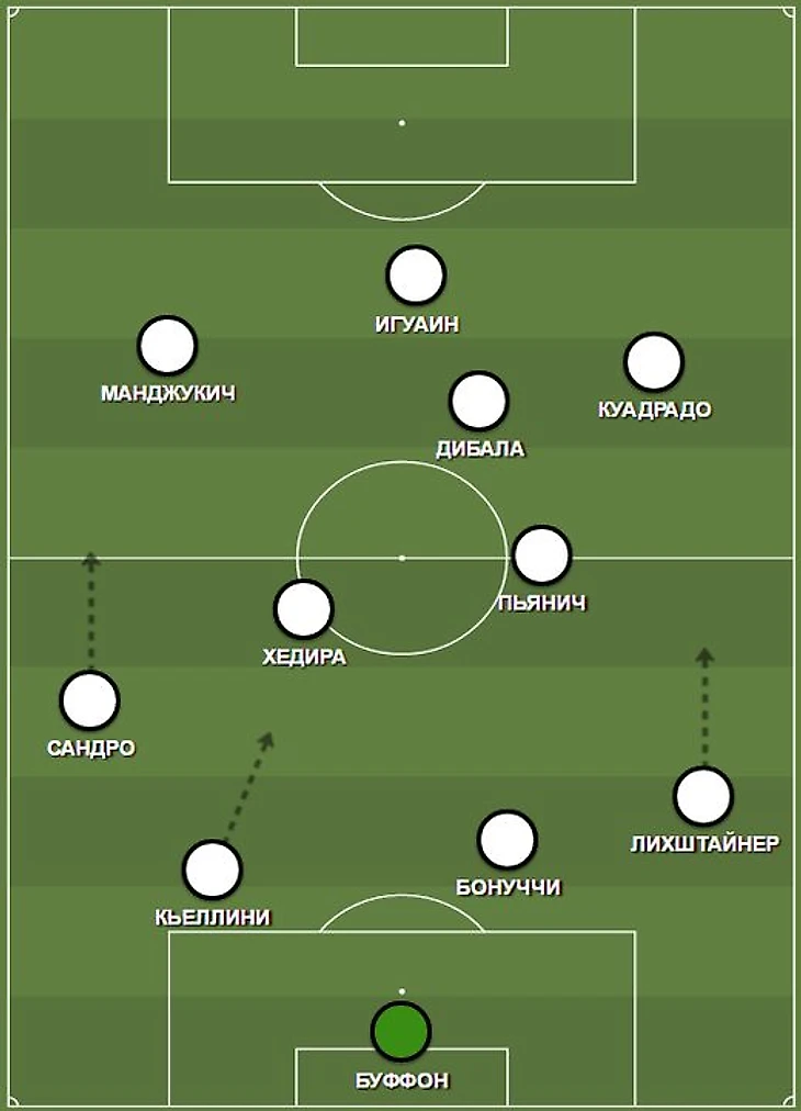 Массимилиано Аллегри не стал изобретать велосипед и предпочел ту схему, которая давала ему результат на протяжении последнего месяца. Тренер не сделал ни единой замены по сравнению с матчем против «Сассуоло». На изумрудный газон стадиона вышли те же самые лица. В очередной раз «Ювентус» расставился на поле по схеме 4-2-3-1, в которой Марио Манджукич занял место левого вингера. Подобные решения до его прихода в Турин могли показаться скорее шуткой, чем правдой.