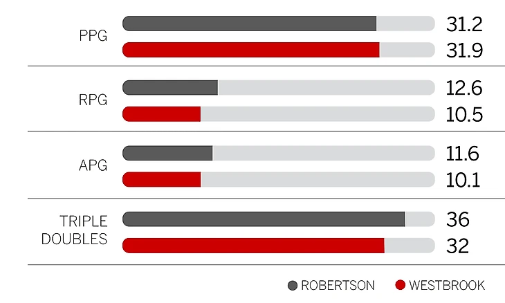 Сравнений статистических показателей Оскара в 1961/62 и Расселла в 2016/17 на одному и том же этап регулярного чемпионата: