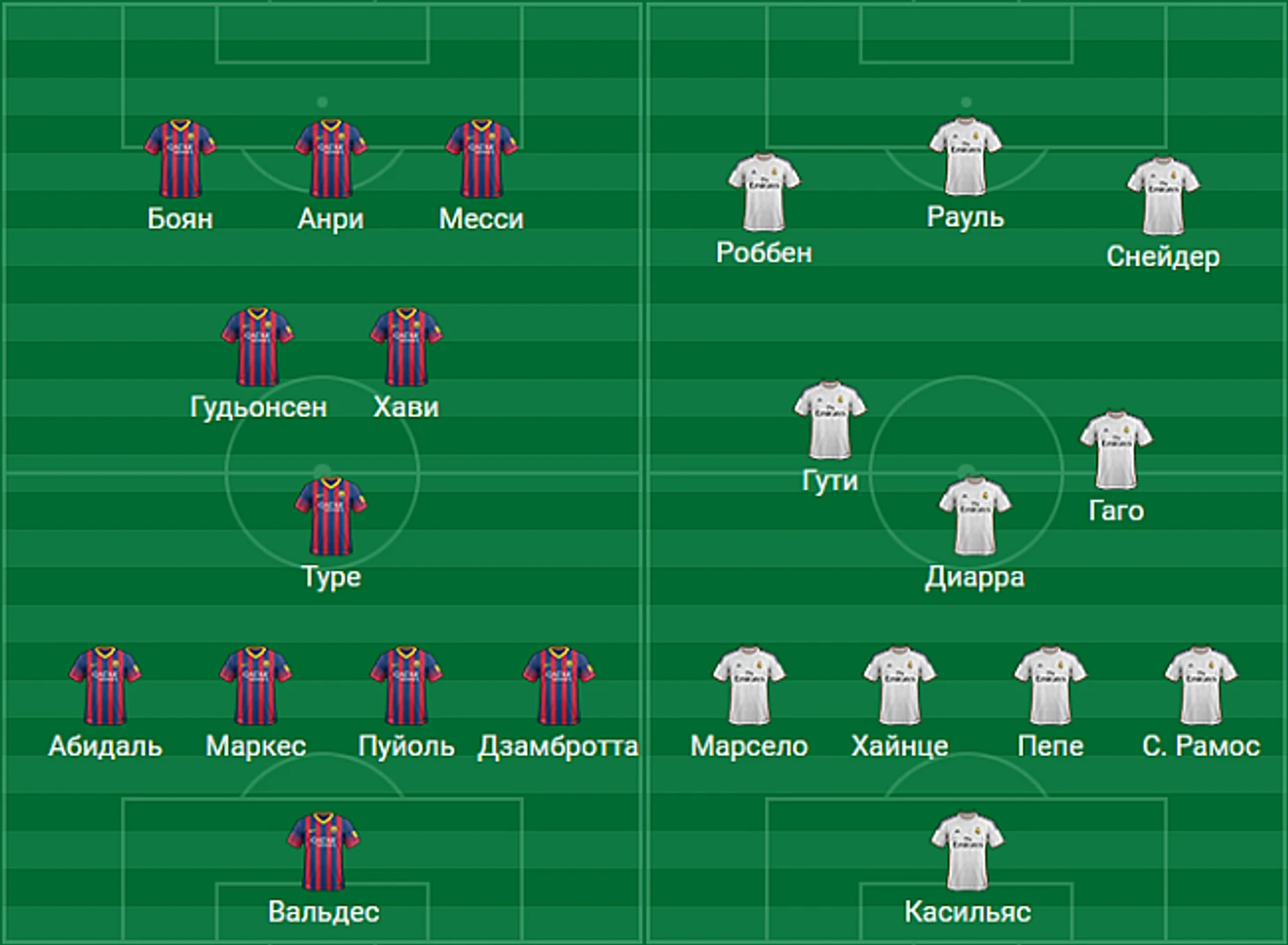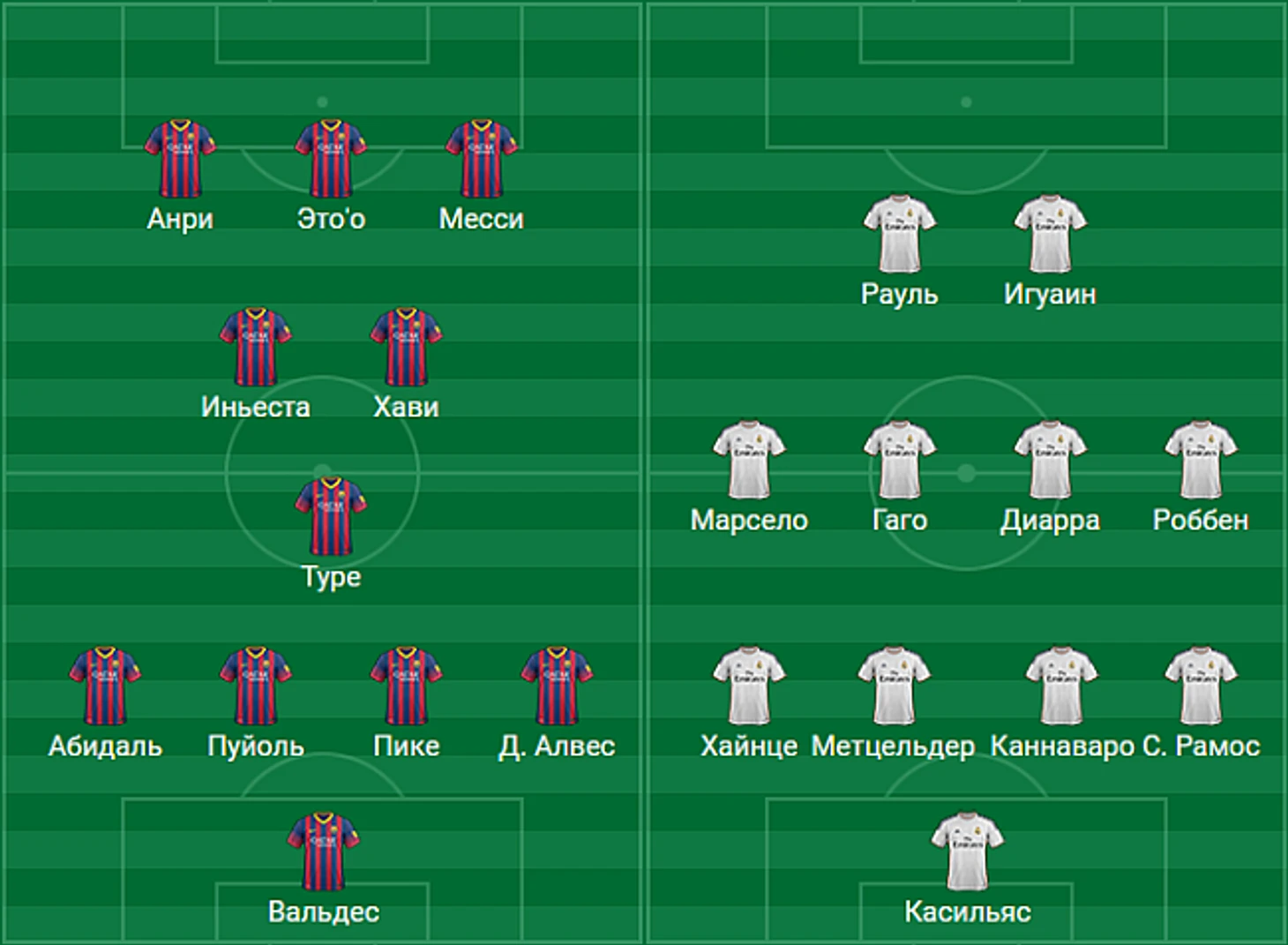 Игуаин, 14 (1:0). Анри, 18 (1:1). Пуйоль, 20 (1:2). Месси, 36 (1:3). Серхио Рамос, 56 (2:3). Анри, 58 (2:4). Месси, 75 (2:5). Пике, 83 (2:6).