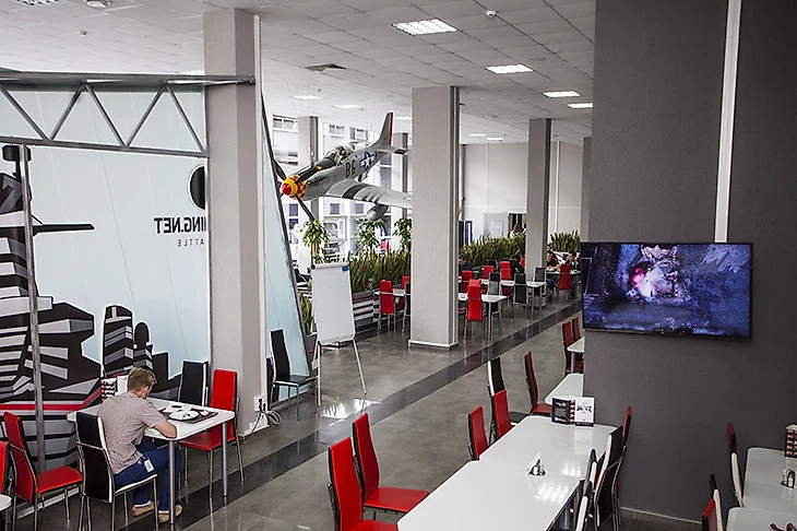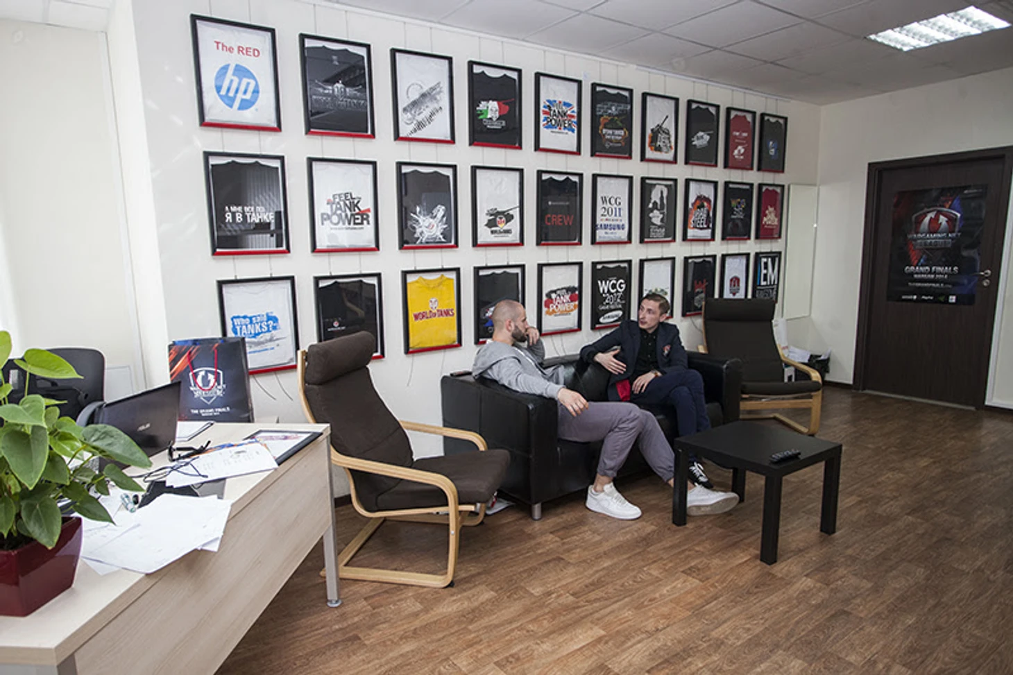 – Некоторые сотрудники служили. На танках в том числе. Я, кстати, служил связистом. Но, вообще, совершенно не обязательно быть танкистом, чтобы делать World of Tanks. Кстати, со стороны служащих к нам нет претензий. Типа: «Я на танке отслужил, а эти геймеры тут придумали себе игру». Нет. Пять лет назад День танкиста отмечали только профессионалы и бывшие срочники. Теперь же (благодаря нам) это международный популярный ивент. Смотри, это наши переговорки. На стенах изображены карты из игры.