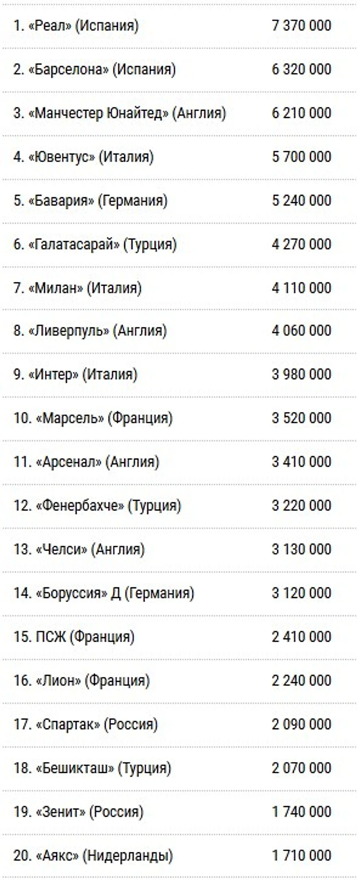 20 самых популярных клубов Европы. «Спартак» и «Зенит» в их числе