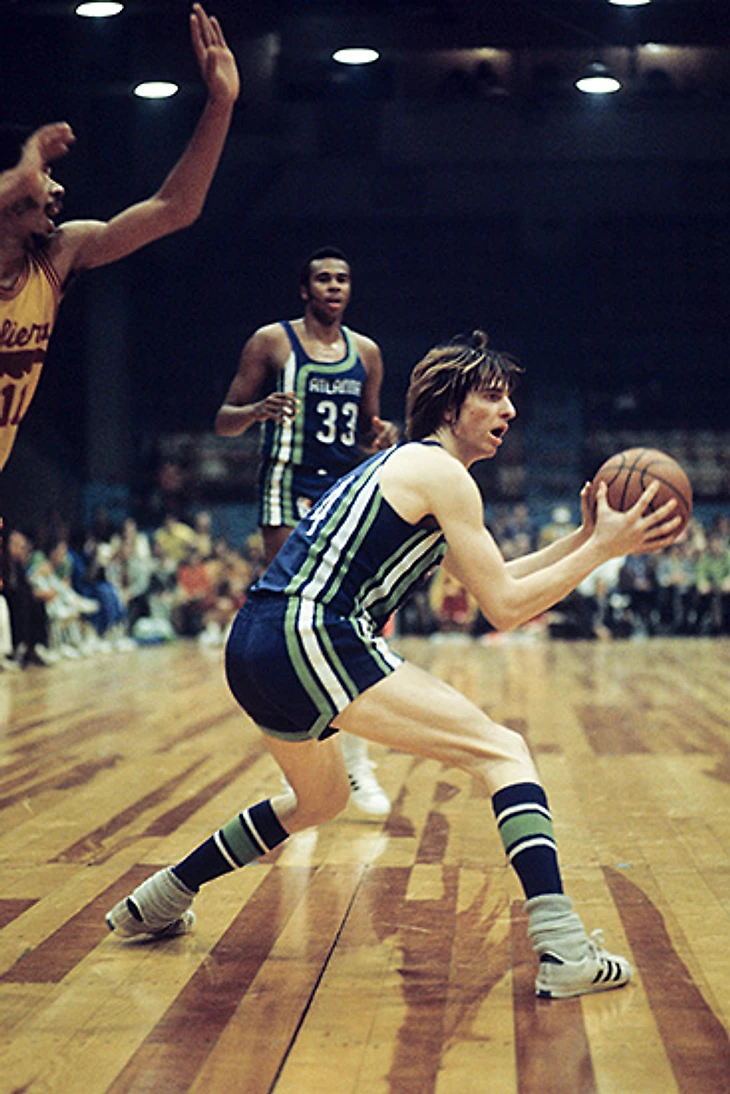 Пистол Пит опередил свое время. Наблюдать за его игрой вживую было подобно двенадцати «Глоубтроттерам» в теле одного человека – ни один пас не казался невозможным, ни один бросок не казался сложным. Он парил по паркету – мяч словно привязан ниточкой к его руке, отсутствующее выражение лица, – и вы не имели представления о том, что же произойдет в следующее мгновение, понимая, что счет на табло не имеет значения, и единственное, что важно – так это сам процесс, само шоу. Фанаты того поколения лучше всего помнят его участие в конкурсе H-O-R-S-E, который CBS проводило в перерывах матчей. Даже карточки с его изображением были просто сказочными, как образец 1975-го года выпуска, на котором у него бородка как у графа.