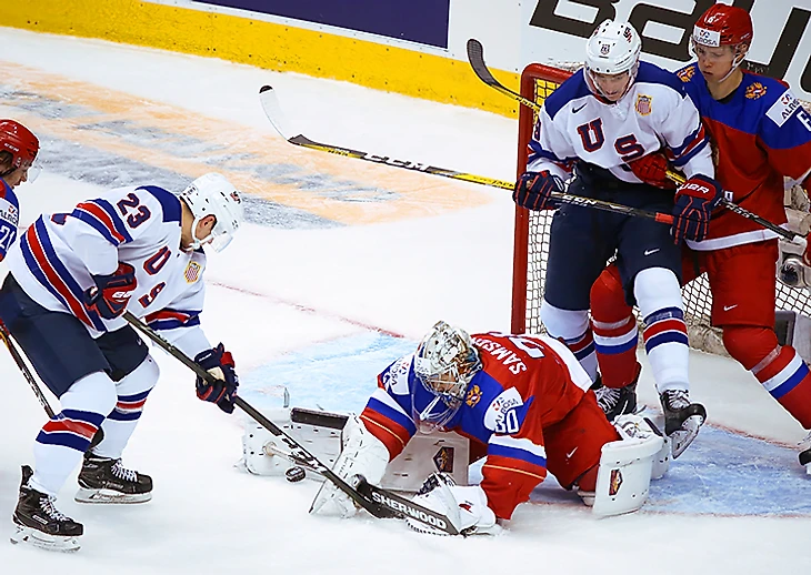 Хотелось побыстрее убедиться, что Самсонов крут, а американцы как раз и созданы для такой проверки. При трех пропущенных у Ильи вполне убедительный процент отраженных бросков (почти 92%), дежурный сэйв для истории МЧМ и испорченный для Тейджа Томпсона буллит. Бонусом — общее впечатление от игры: пяти шайб от канадцев как ни бывало, Самсонов спокоен, выходит из ворот, готов к провалам защиты и волнообразным атакам с сериями бросков из ближнего боя. Это все нам очень понадобится.