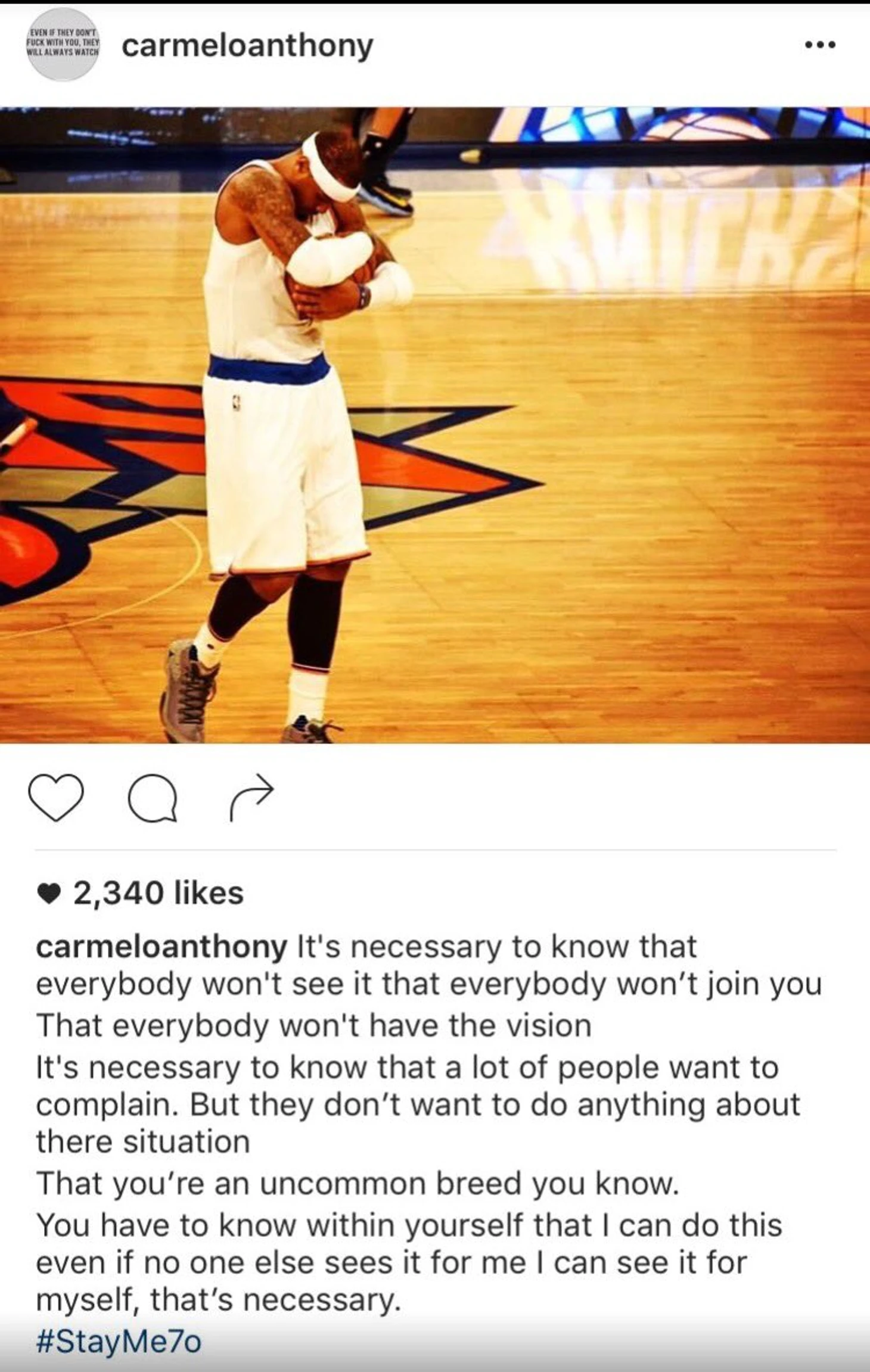 Как и друг Леброн, Кармело сразу же принялся все отрицать – мол, это слова Jeezy, а у него только недавно вышел альбом. Выяснилось, правда, что хоть у Jeezy действительно вышел альбом, размещенный пассаж был совершенно в другом альбоме… но разбираться в подробностях никто не стал – достаточно унылости «Никс» в мире, что бы ее еще плодить такими вот унылыми способами.
