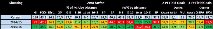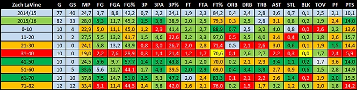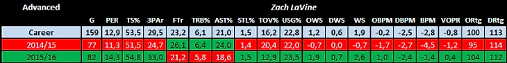 Настоящий же прогресс мы увидели после перерыва на Матч всех звезд, когда его перевели на роль стартового второго номера и все его статистические показатели резко повысились. За 54 игры до МВЗ ЛаВин в среднем проводил на площадке по 24,4 минуты, бросал 43,4% с игры, 31,9% из-за трехочковой линии и в среднем забивал по 12,8 очков за игру. А за 28 игр после МВЗ его процент с игры повысился до 48%, трехочковый до 44,4% (фактически он стал лучшим снайпером команды) и забивал по 16,4 очка за игру. Выбор позиций для удобного броска значительно улучшился и теперь уже редко приходилось хвататься за голову, когда Зак в очередной раз шмалял из крайне сложных положений.