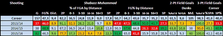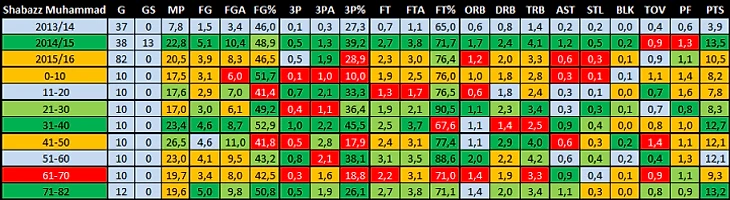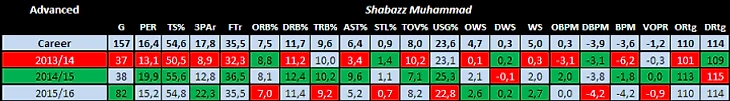 После прорыва в прошлом году от Шабазза ждали утверждения себя как игрока со скамейки, который может зажечь. Но сезон выдался для Мухаммада, как американские горки: то он поднимался вверх и выдавал очень хорошие матчи, то совершенно не попадал в игру. Также показалось, что тренерский штаб не решил окончательно, какая все же роль больше подходит защитнику.