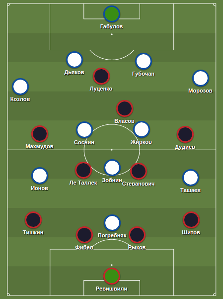 Андрей Кобелев после удачного перестроения на схему с тремя центральными полузащитниками в матче с "Кубанью" решил сохранить эту расстановку и в игре с "Мордовией", даже несмотря на потерю Денисова в центре поля. Скандального сборника по позиции заменил Соснин (и заменил отлично, но об этом позже), также позицию в центре поля занял Жирков, а Зобнин был выдвинут чуть вперед. Андрей Гордеев по сравнению с матчем против "Анжи" несколько изменил фланги - отчасти это было вызвано потерей из-за перебора карточек Мухаметшина, место которого на левом краю занял Махмудов, отчасти - тактическими соображениями. Понимая, что против "Динамо" придется больше обороняться, он передвинул универсала Дудиева в полузащиту, а правый фланг обороны занял Шитов.