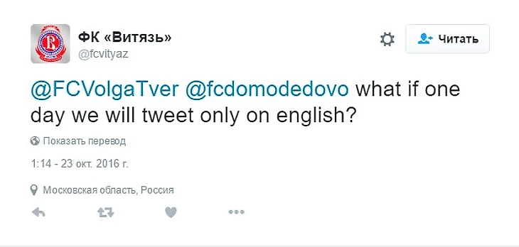 Дальше в игру вступил твиттер подольского «Витязя», спросив: