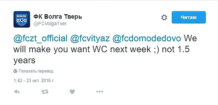 WC с английского переводится, как туалет. Именно потому в Твери не упустили шанса немного посмеяться над ореховцами: