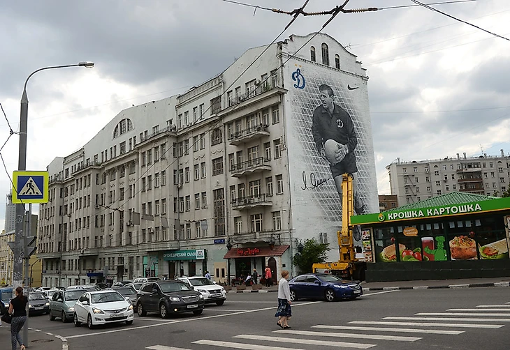 В Москве на одном из домов около Дома футбола появилось огромное граффити с изображением Льва Яшина. Вот как оно там оказалось: