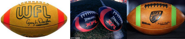 В WFL (World Football League, 1974-75), оставившей после себя традицию проводить Pro Bowl (Матч Всех Звезд) на Гаваях, играли желтым мячом с красными полосками. В XFL (2000-2001), пытавшейся скрестить футбол с рестлингом, изобрели черный с красным мяч. Ныне существующая UFL (United Football League) использует мяч со светло-зелеными полосками.