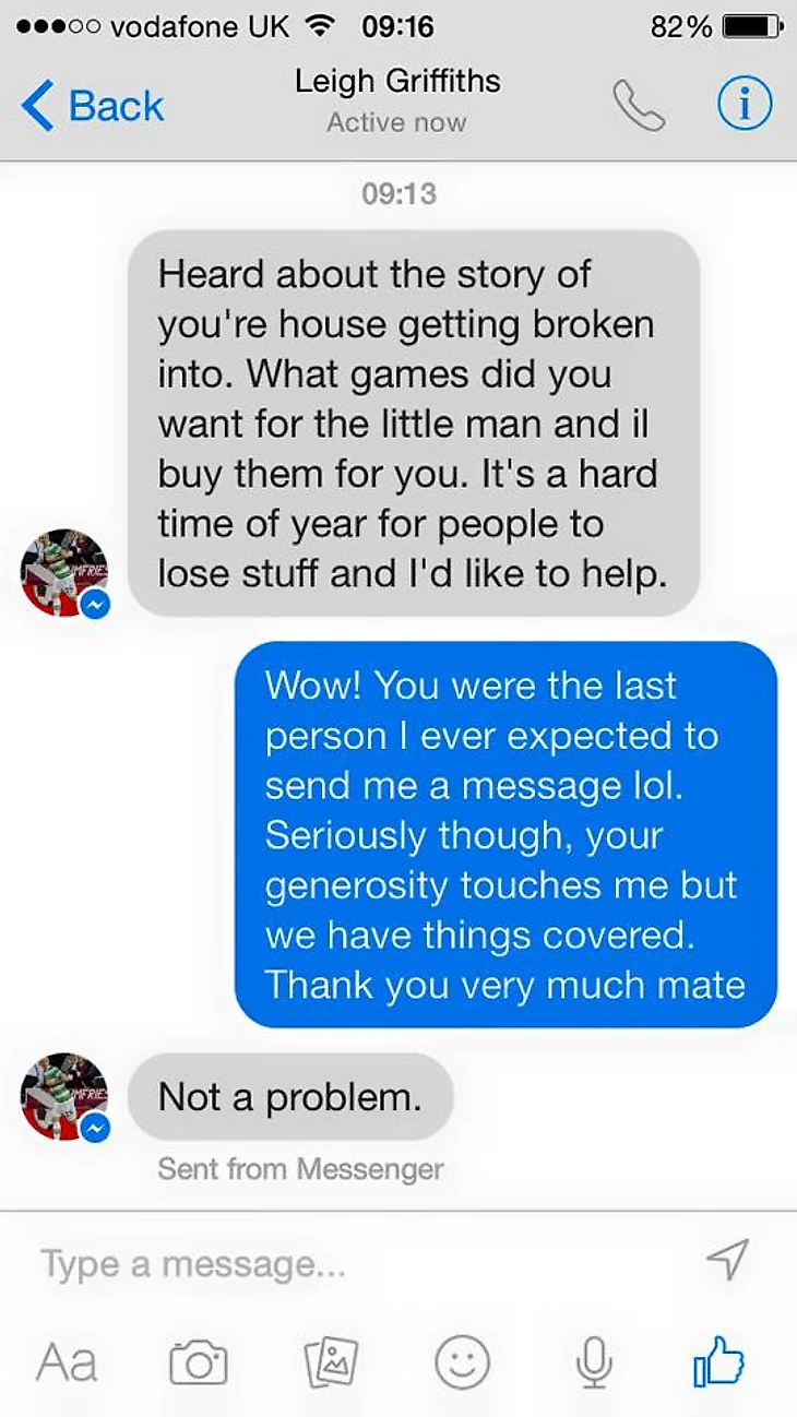День назад Ли Гриффитс услышал историю о семье, чей дом был ограблен. Форвард «Селтика» решил не оставаться в стороне и просто отправил главе семьи сообщение, в котором предложил позаботиться о рождественских подарках для ребенка.