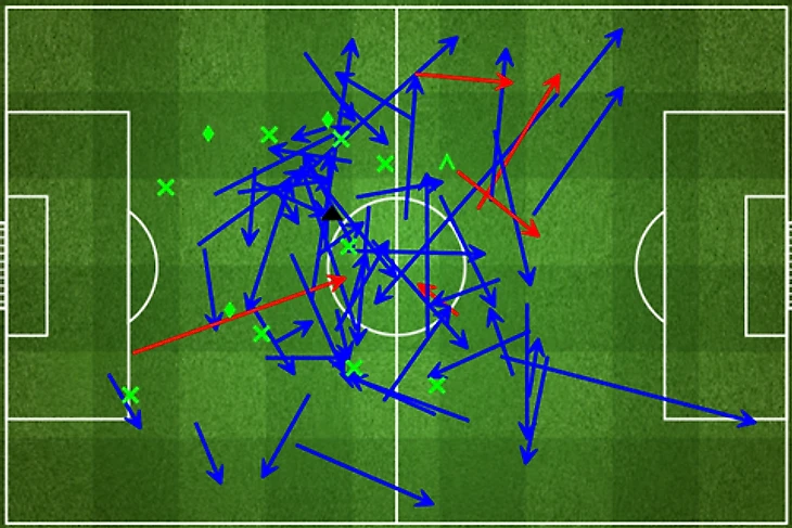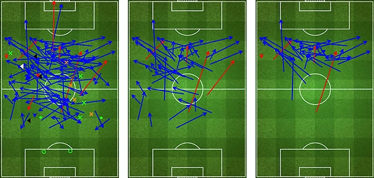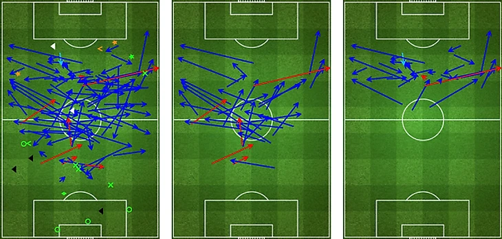 Игру Бенталеба можно оценить по следующим схемам (слева направо – все выполненные передачи / передачи, направленные вперед / передачи в «атакующую треть» поля). Синим цветом отображены успешные передачи: