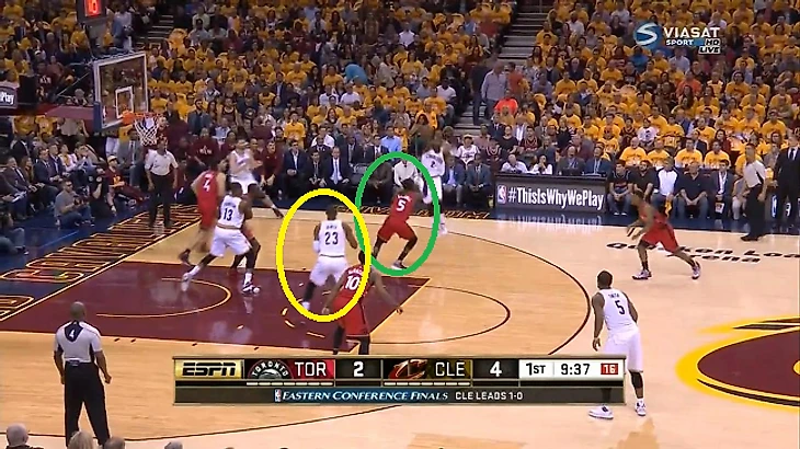 «Рэпторс» действительно не уделяют Джеймсу повышенного внимания в защите. Хорошей иллюстрацией тому служит, например, этот эпизод. В нем Кэрролл бросил Леброна под кольцом ради того, чтобы выйти на периметр к получавшему мяч Ирвингу.