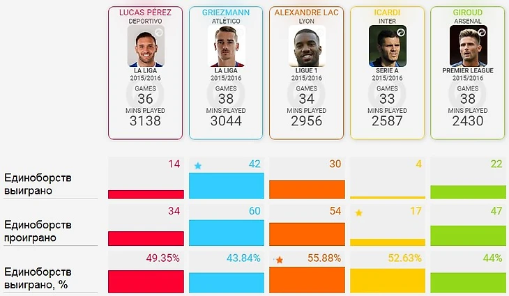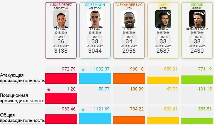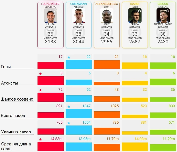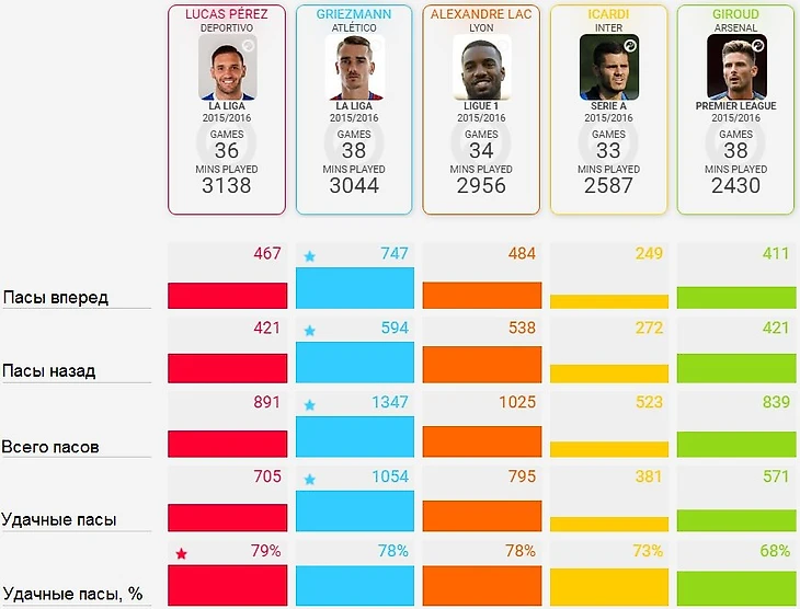 Третья таблица к ряду, где Икарди выглядит как игрок ниже уровнем, чем остальные ребята. Если же брать во внимание только Лукаса, Гризмана и Ляказетта, то лучшим показателем обладает Антуан. Хотя у Переза и больше точность пасов, но к-во этих пасов у Гризмана намного больше. И если по голам лучшими были Гризман и Лукас, то по пасам Гризман и Ляказетт.