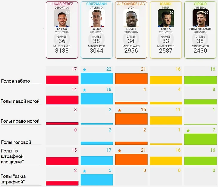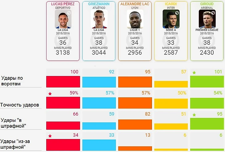 А вот тут уже единолично лидирует Лукас. Хоть и не с большим преимуществом перед Гризманом и Ляказеттом. Хоть ударов из-за штрафной Лукас и нанес больше лишь на один, чем Гризман, но ударов всего было сделано немного больше. Третью строчку занимает форвард Арсенала. Последний, как обычно, Икарди.