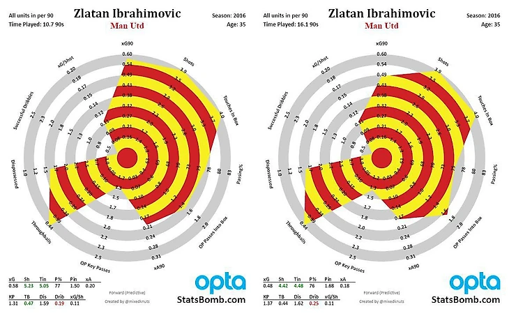 Кроме того, если мы вглянем на его статистические радары в этом сезоне (слева – радар в разгар голевой тишины, когда Златан забил лишь однажды в 11 матчах; справа – радар накануне матча с «Вест Бромом», когда у него было уже 8 голов в 8 матчах), то увидим, что даже когда в октябре-ноябре Златан проматывал один момент за другим, можно было с большой долей уверенности предсказать, что голы скоро вернутся – просто потому что форвард его уровня, который стабильно наносит так много ударов, не может так долго упускать так много хороших моментов. Разница в xG – минимальна, радары почти идентичны.