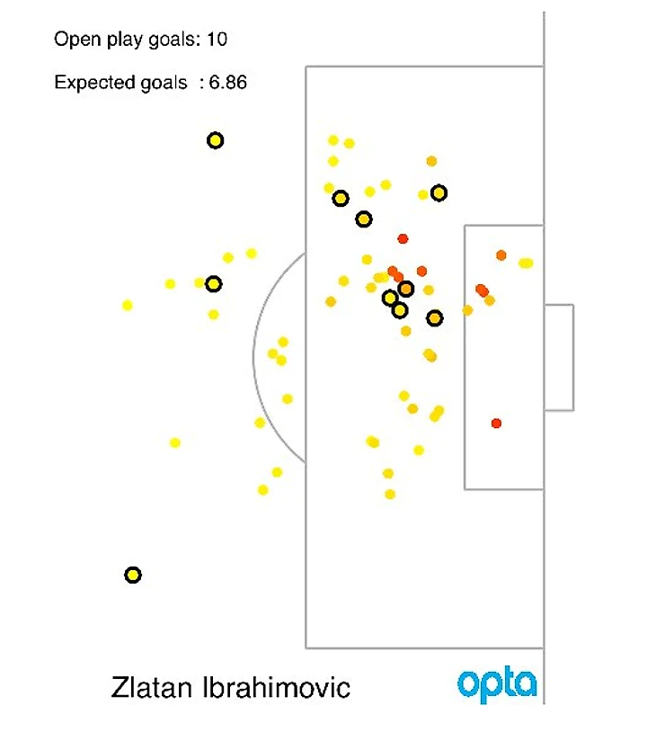 Вот еще одна наглядная разбивка: если мы взглянем на xG последних 150 ударов Златана (то есть захватим еще и финальную треть сезона в лиге 1), то увидим, что швед находится на семнадцатом-восемнадцатом месте среди всех игроков премьер-лиги в плане реализации эпизодов с ценностью от 0,4 до 1 xG (то есть либо просто опасных моментов, либо моментов в которых точно надо забивать). Другими словами: клише вроде «инстинкта убийцы» – это точно не про него. При этом, когда дело доходит до эпизодов с ценностью от 0 до 0,4 xG (то есть либо вообще-не-моментов, либо совершенно не очевидных), Златан подскакивает на пятое-шестое место среди всех игроков АПЛ.