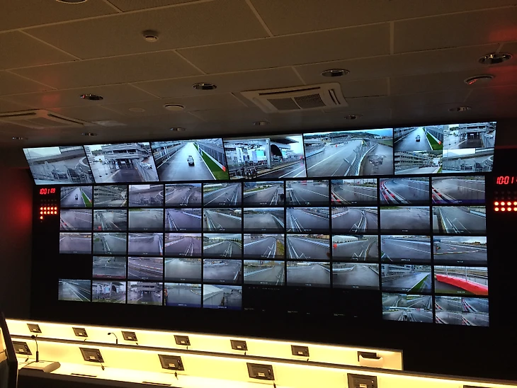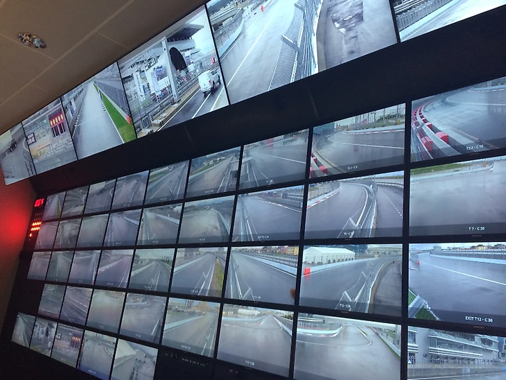 Когда проходишь длинную цепочку из более чем 30 боксов, упираешься в главный корпус автодрома: здесь размещены комнаты стюардов и центр управления гонкой – место, где следят за всем, что происходит на трассе, и в случае чего принимают важные решения – вплоть до остановки гонки. Центр управления – это 50 экранов, на которые выводится изображение со всех камер, охватывающих гоночный трек, пульт, контролирующий все светофоры, много микрофонов для связи с другими сотрудниками. Камеры на трассе настолько мощные (каждая двигается на 360 градусов по горизонтали), что при приближении можно разглядеть не то что детали болида – даже украшение на шее какой-нибудь болельщицы на трибуне.