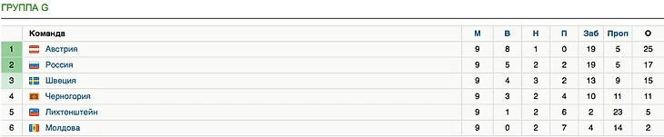 Если Россия сыграет вничью с Черногорией, а Швеция обыграет Молдову, то у обеих команд будет по 18 очков. Преимущество по дополнительным показателям – у России, так как при равенстве очков в первую очередь учитываются очки, набранные в личных матчах (Россия – 4, Швеция – 1).